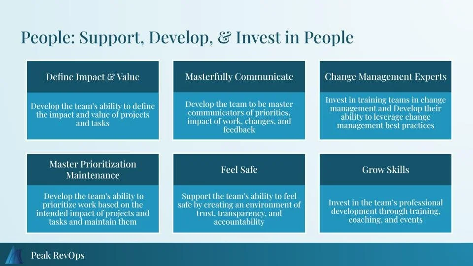 People: Support, Develop, and invest in People. Your people are not only your most important asset to maximizing your team's impact but also the means of successfully executing the rest of the methodology.